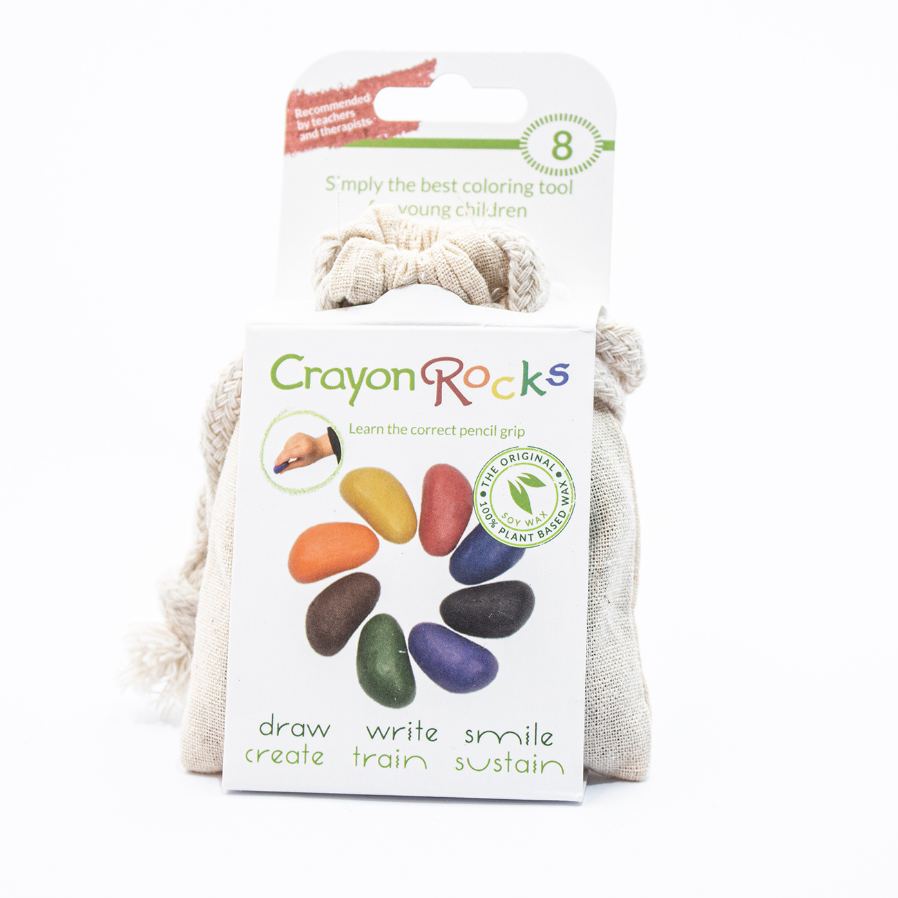 Crayon Rocks sojakridt er udformet som små sten, og giver et godt ergonomisk greb, der træner barnets pincetgreb.